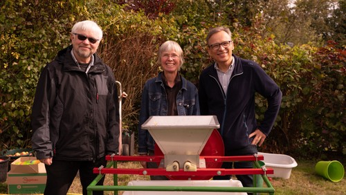 Der Apfelbaum inmitten des naturbelassenen Teils der Wiese war der Namensgeber: „Apfelfest“! Daher präsentierte sich der Grüne Hahn mit seinen Aktiven mit einer Apfelpresse, die der NABU Haltern dankenswerterweise zur Verfügung stellte. Nach einigem Zögern ging es munter zu: mitgebrachte Äpfel schneiden, in einem Zerkleinerer stückeln und dann schließlich in einer Presse ausquetschen. Der trübe Saft floss in den Glaskrug, wurde direkt verkostet und schmeckte richtig gut. Karolin Wengerek stiftete ihre gesammelten Flaschen und so konnte der leckere Saft auch mit nach Hause genommen werden. Die Kinder pflückten munter weitere Äpfel vom Apfelbaum, so dass der Nachschub nicht ausging. Auch veranstaltete der Grüne Hahn ein Apfelquiz, das Barbara Prolingheuer entwarf. Es waren 15 Fragen rund um den Apfel zu beantworten. Die Gewinner freuten sich über Naturalien, natürlich rund um den Apfel. Und die Aktiven des Grünen Hahns freuten sich über die tolle Resonanz.