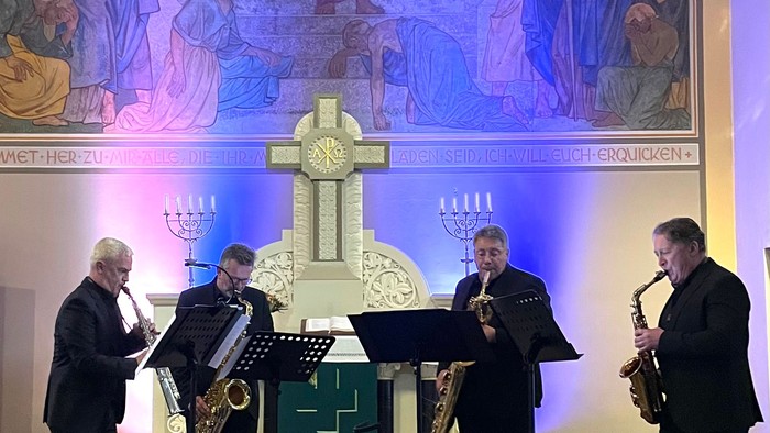 Am Sonntag 28.9. ludt der Freundeskreis Kirchenmusik der Evangelischen Kirchengemeinde e.V. zum Konzert mit dem Saxophonquartett „Blattwerk“ in die Erlöserkirche ein. Frau Pfarrerin Merle Vokkert begrüßte die Zuschauer sehr herzlich in der voll besetzten Erlöserkirche und stimmte auf das Konzert ein. Es war eine Freude zu erleben, wie Beethovens Klassiker „Ode to Joy“, als erstes Stück die drei Saxophonisten und Albin Hauser, mit seiner Klarinette, ein paar Takte feine Klassik präsentierten und dann, ein meisterhaftes Arrangement, war es plötzlich ein swingender Jazz, der in der Erlöserkirche ertönte und mit seinem Sound, den Tempiwechseln und seiner Fröhlichkeit den typischen „Blattwerk“ Sound hören ließ. Albin Hauser führte an diesem Abend durch das Programm, wobei er informativ, gewandt, humorvoll und professionell agierte. Die kreativen meisterhaften Arrangements, die überwiegend von Hartmut Salzmann stammen, lassen die Bewunderung für das Genie der großen Meister spüren. Im Konzert entsteht z.B. aus einem Ton, der immer länger anhält, eine Disharmonie, sie leitet den Blattwerk-Sound ein und plötzlich ist die Klassik aufgehoben. Aus dem Fanfarenstoß in Beethovens 5. Sinfonie jazzt es nach kürzester Zeit in allen denkbaren Nuancen und Klangfarben. Es wird imposant, laut, leise, irrwitzig schnell und auch sehr fein und gefühlvoll. Die 4 Musiker zeigten ein perfektes Zusammenspiel. Hartmut Salzmann, Timur Isakov und Ivan Jones überzeugten durch tolle, spannende Soli und dem sichtbaren Spaß am gelungenen Zusammenspiel. Klarinettist Alban Hauser zeigte sich als Virtuose mit seinem Instrument, mal über viele Takte in unfassbar schnellem Tempo, sehr forciert und dann aber auch weich und gefühlvoll. Standing Ovations der Zuhörer und ein Mambo von Jack Hirsch als Zugabe beendeten dieses wunderbare Konzert mit Blattwerk